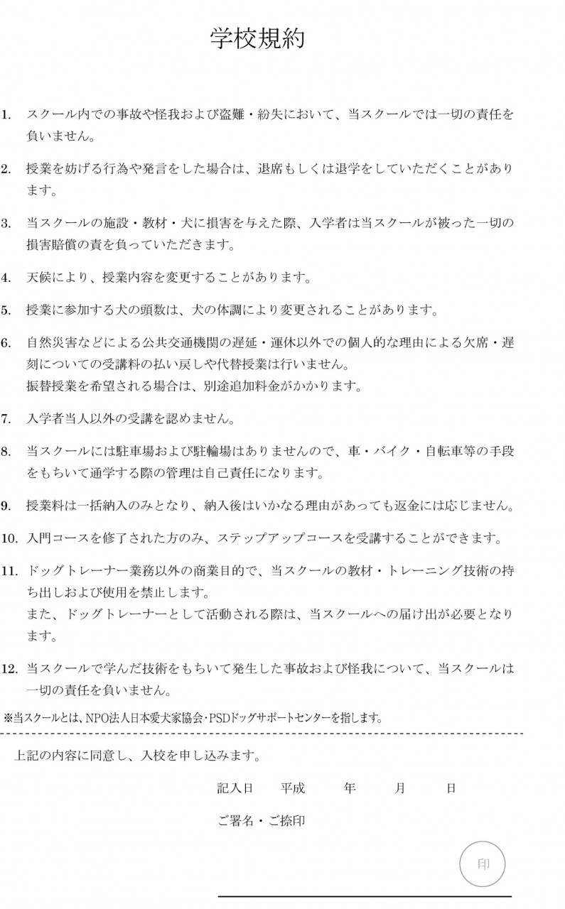 なお、入校当日は「学校規則」に著名・捺印の上、ご持参ください。